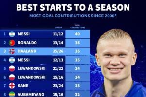 仅次于梅罗!本世纪赛季开局进球贡献数:哈兰德35球位列历史第三